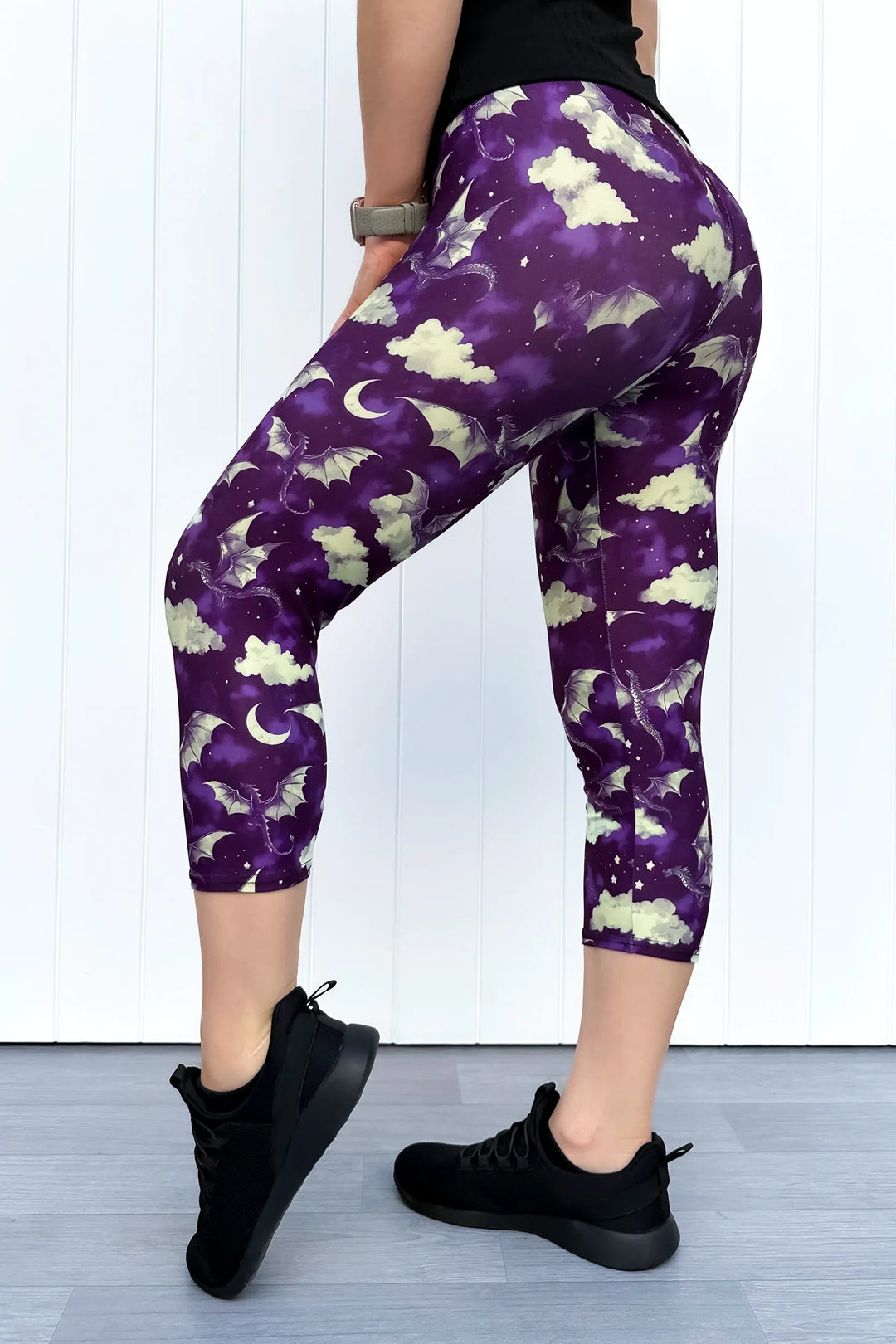 Person wearing black capri leggings with purple butterfly pattern against a white background