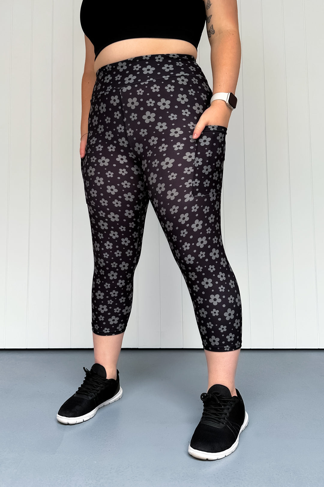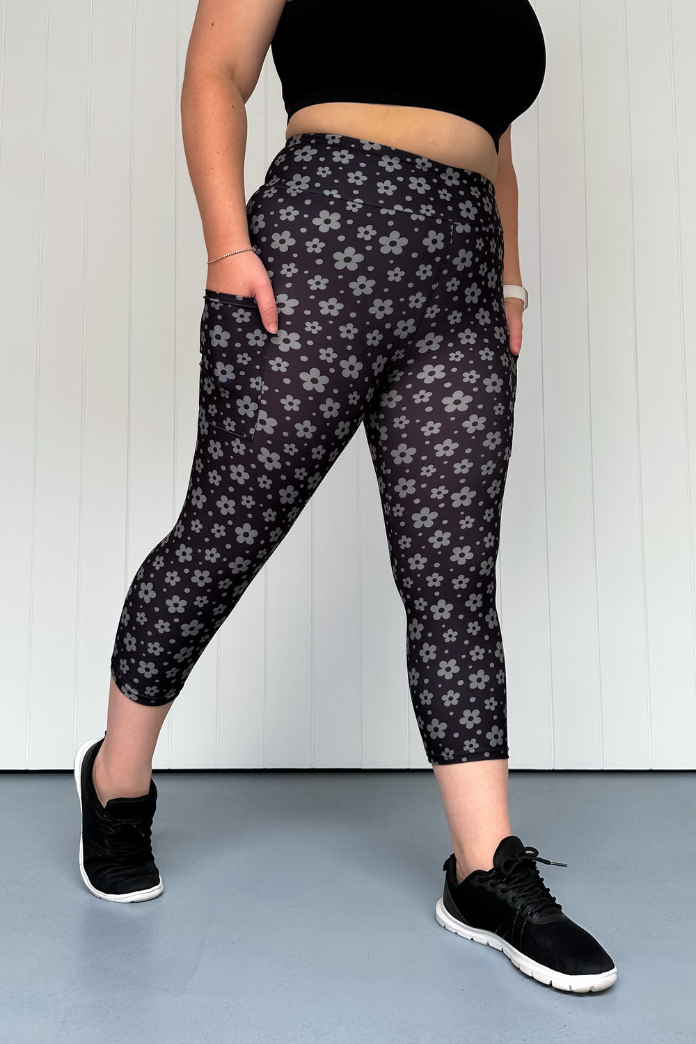 Black Daisy Confetti - Casual - Capri Leggings - Pockets