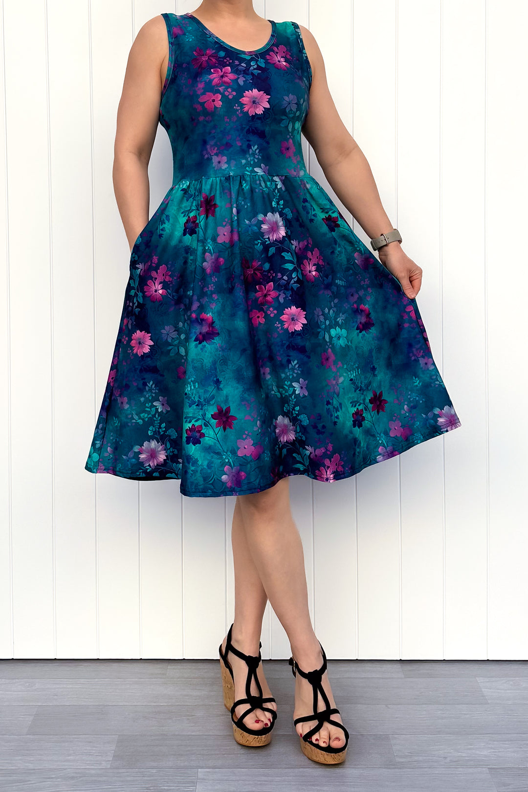 Woman wearing a floral dress with pink and blue flowers against a white wooden panel background