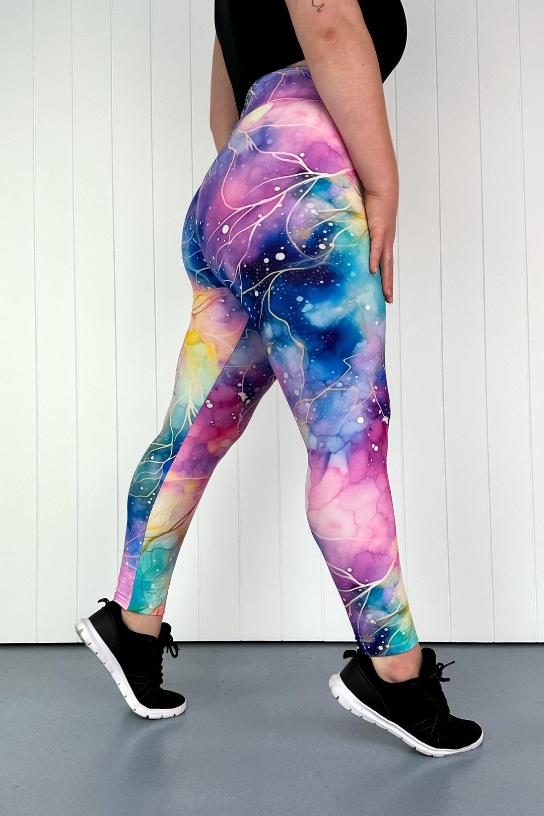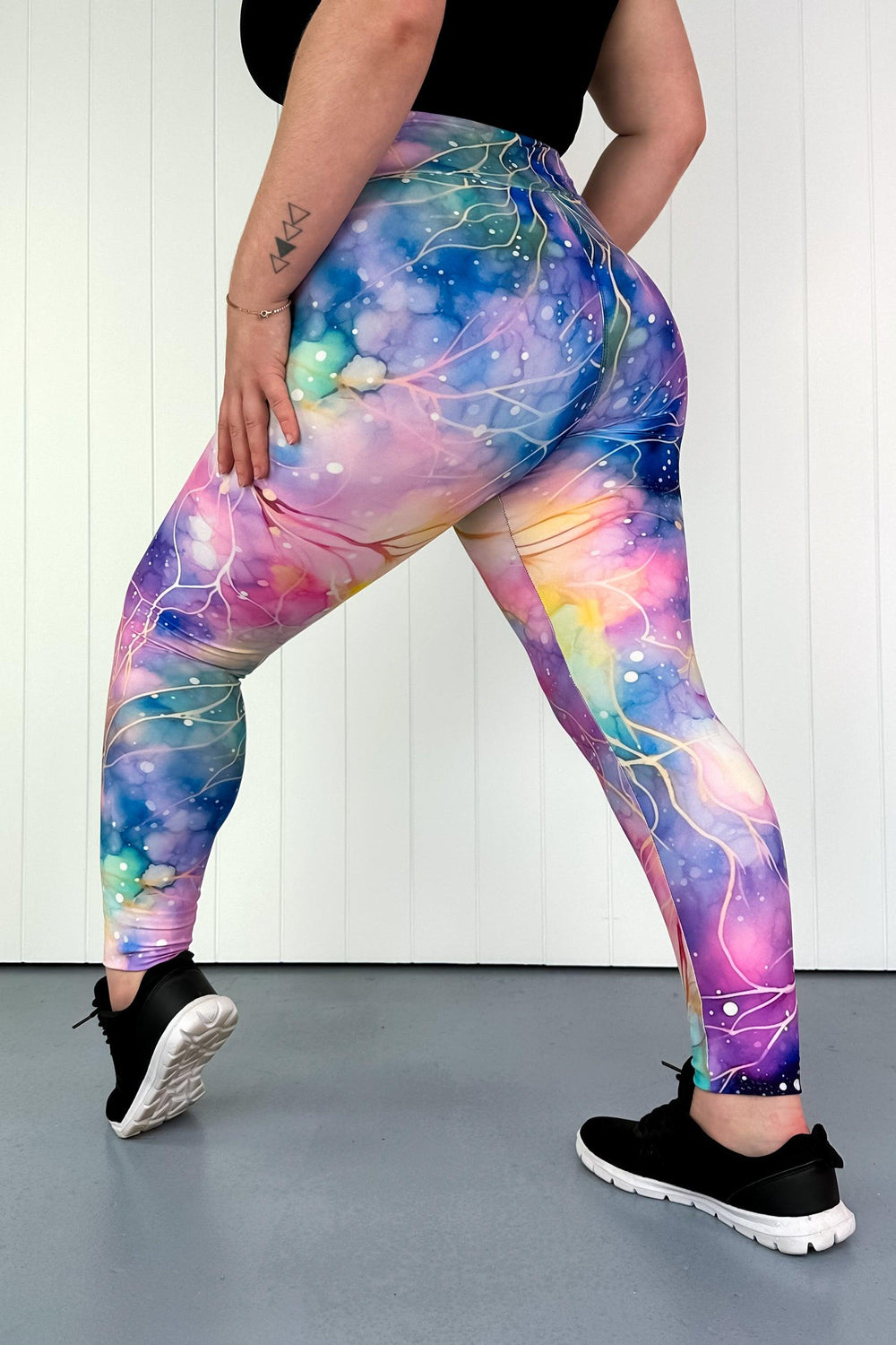Person wearing colorful leopard print leggings with black shoes on a white background