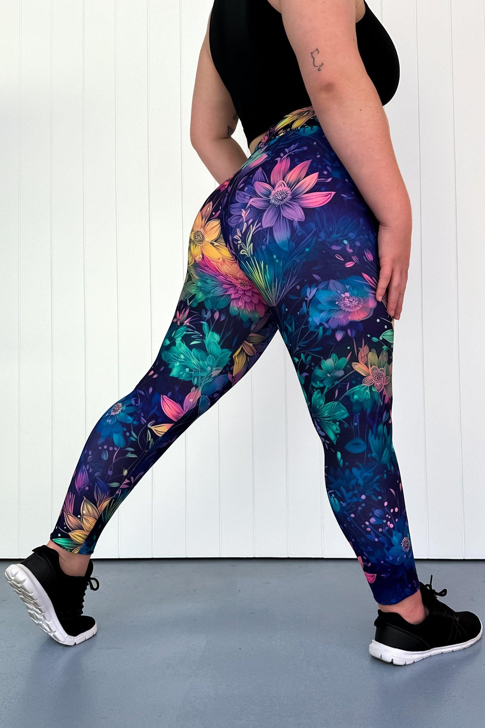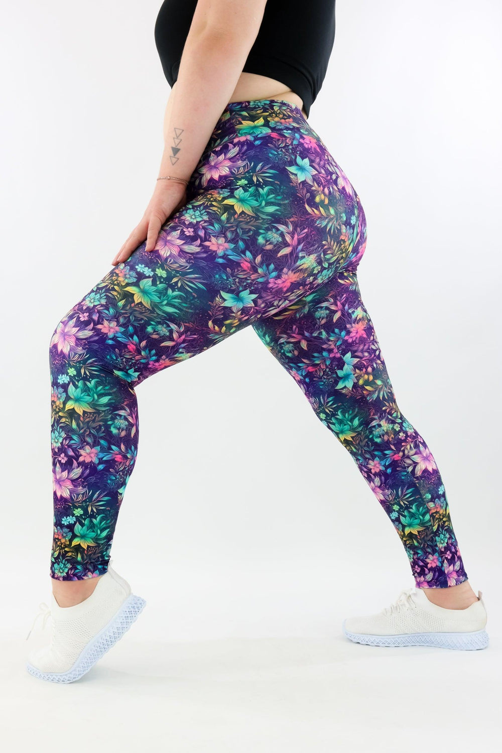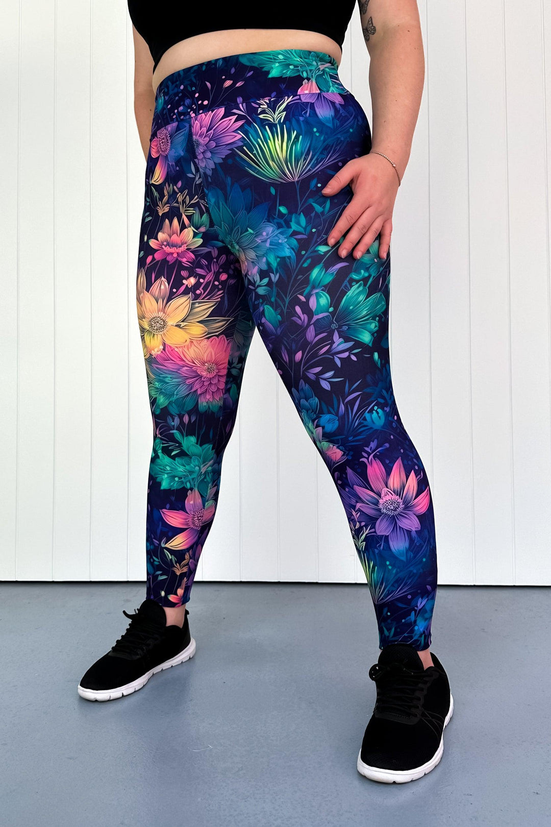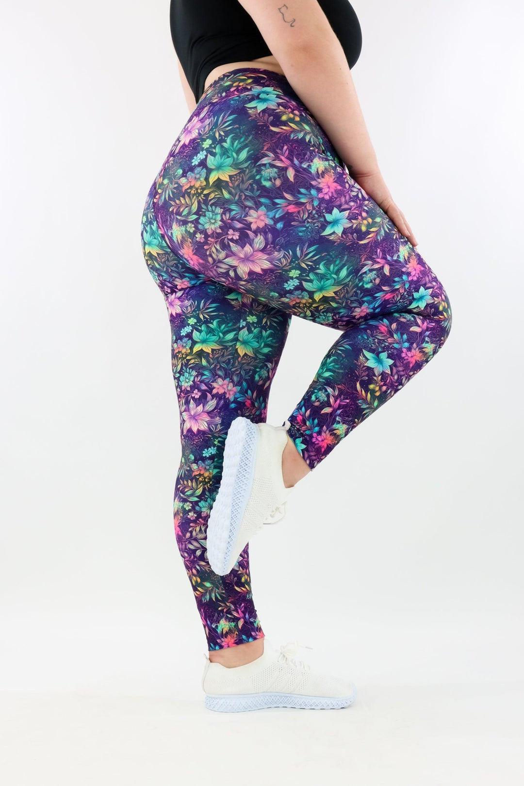Person wearing black leggings with floral pattern and black sneakers on a white background
