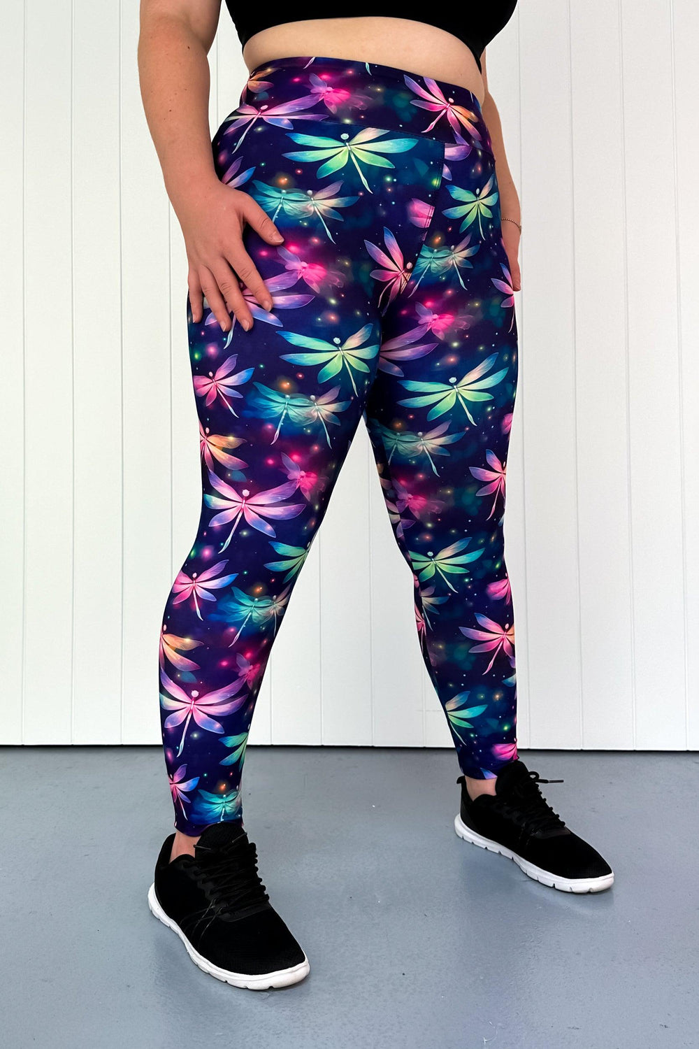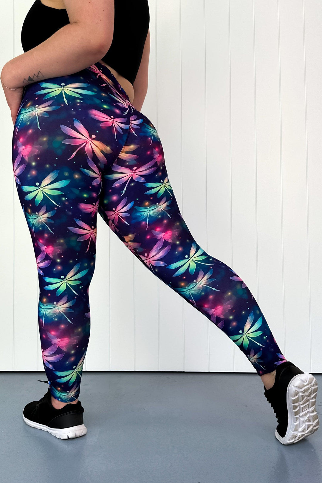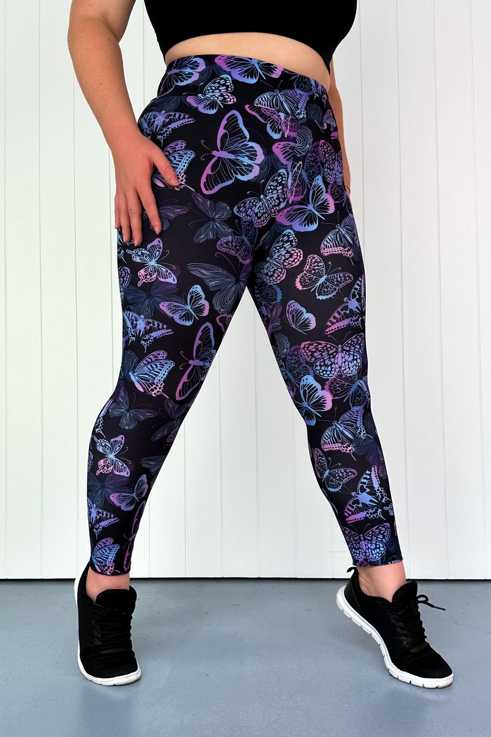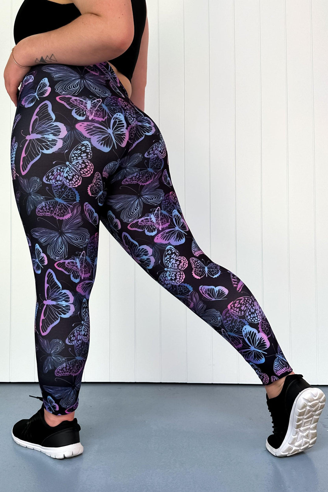 Person wearing black leggings with colorful butterfly pattern on a white background