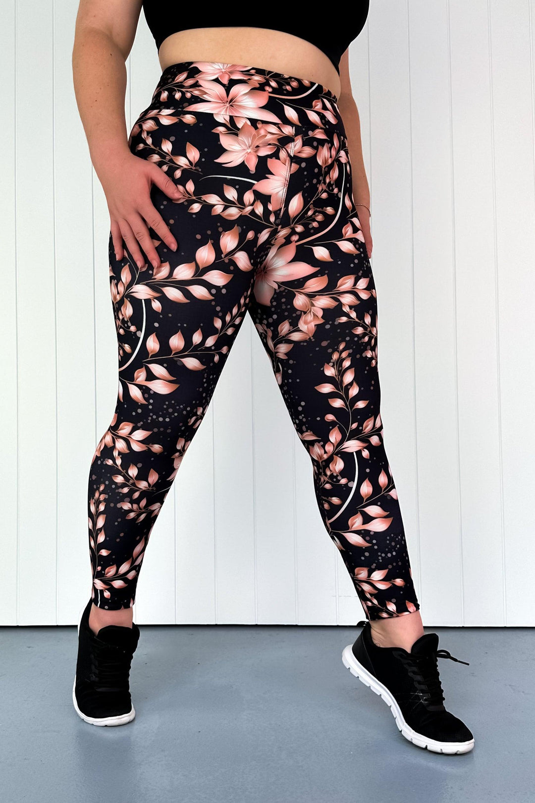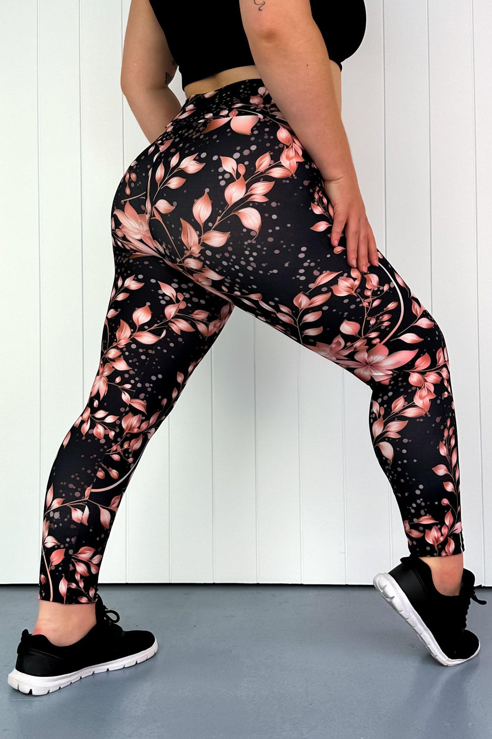 Person wearing black leggings with pink floral pattern and black sneakers on a white background