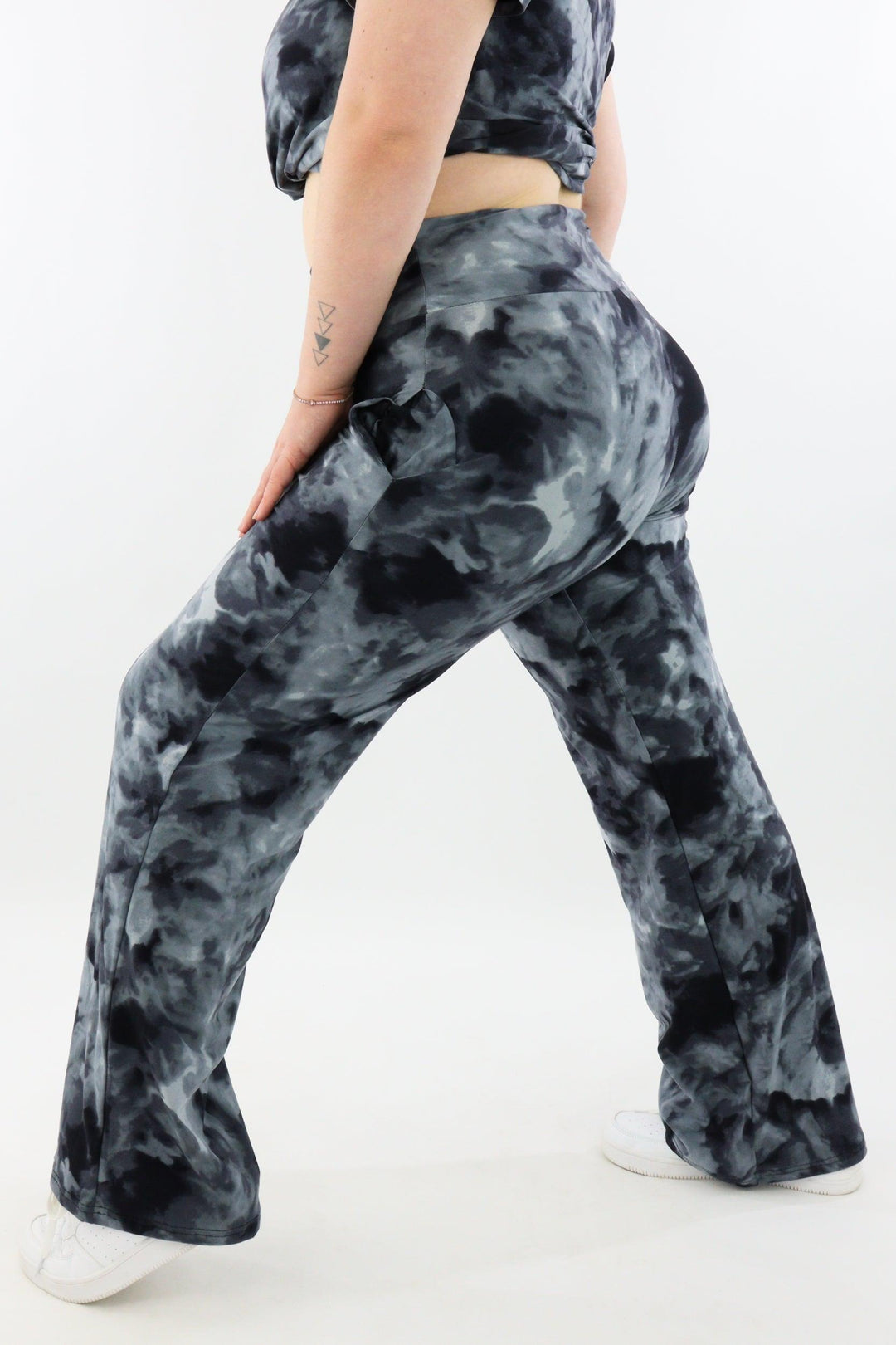 Person wearing dark blue mandala patterned leggings and black shoes on a white background