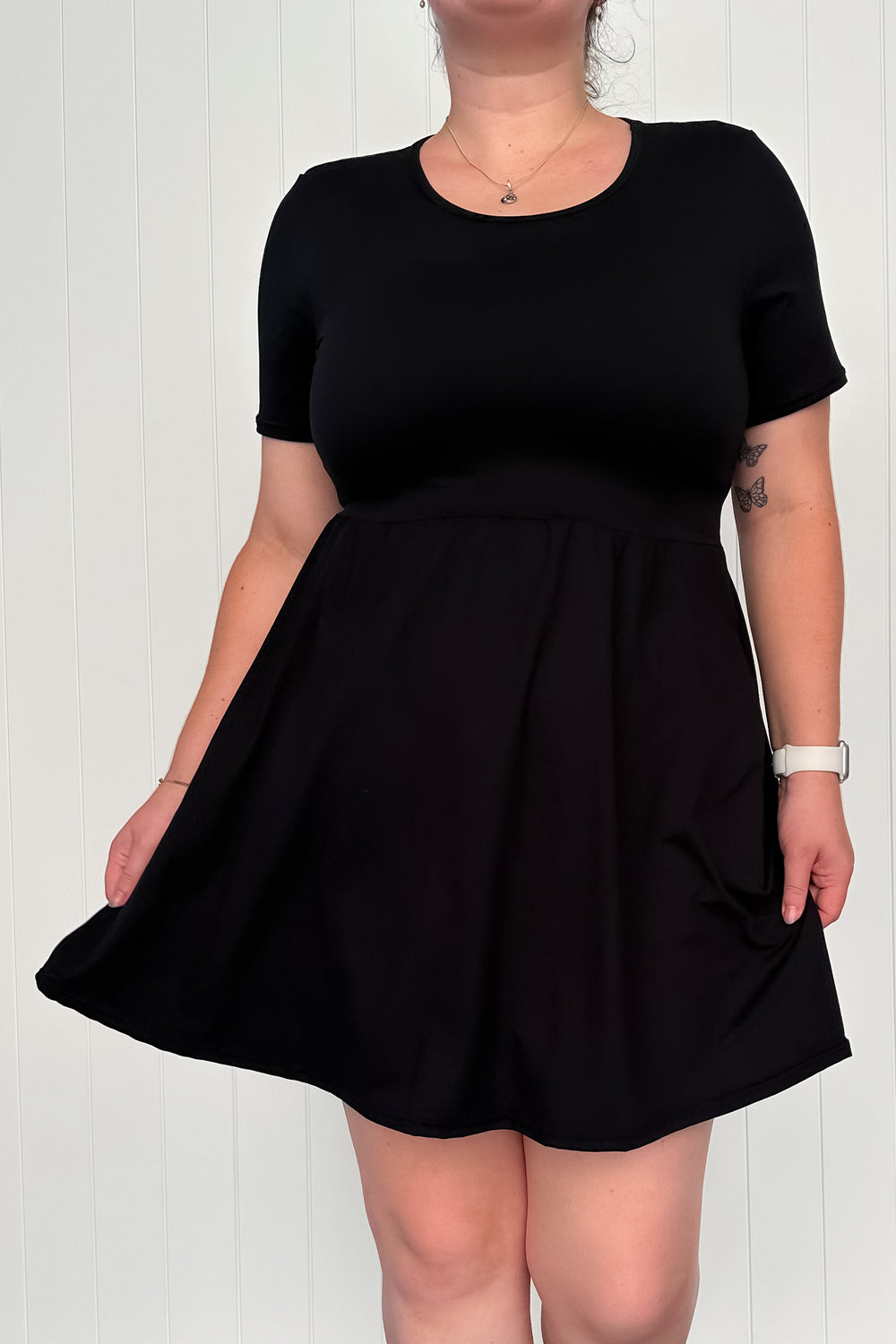 Black - Knee Length Dress - Short Sleeve - Pockets