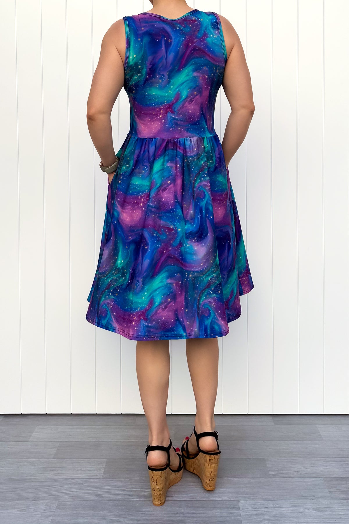The Aurora Sky Sleeveless Knee Length Dress brings together swirling purples, teal blues and stardust speckles in a dress that looks alive with cosmic motion. It’s vibrant, magical, and the perfect blend of galaxy-inspired beauty and wearable comfort. The soft stretch fabric moves easily, the sleeveless cut keeps things cool, and the pockets make it a dress you'll wear on repeat.