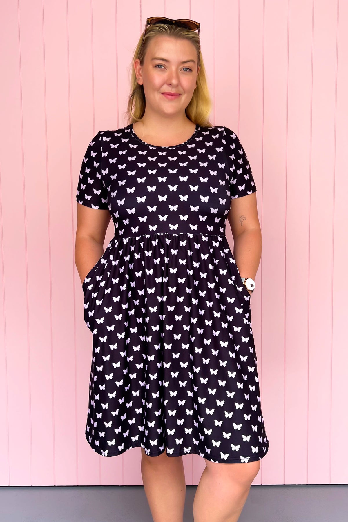 Our Butterfly Imprint Knee Length Dress is for when you love butterflies, but you also love wearing black. The addition of soft lilac butterflies adds just enough fun to brighten your mood, while the black background keeps this dress sleek enough to style with just about anything. And if you're someone that prefers wearing shorts under your dress for extra comfort, you can pair it with the matching shorts*.