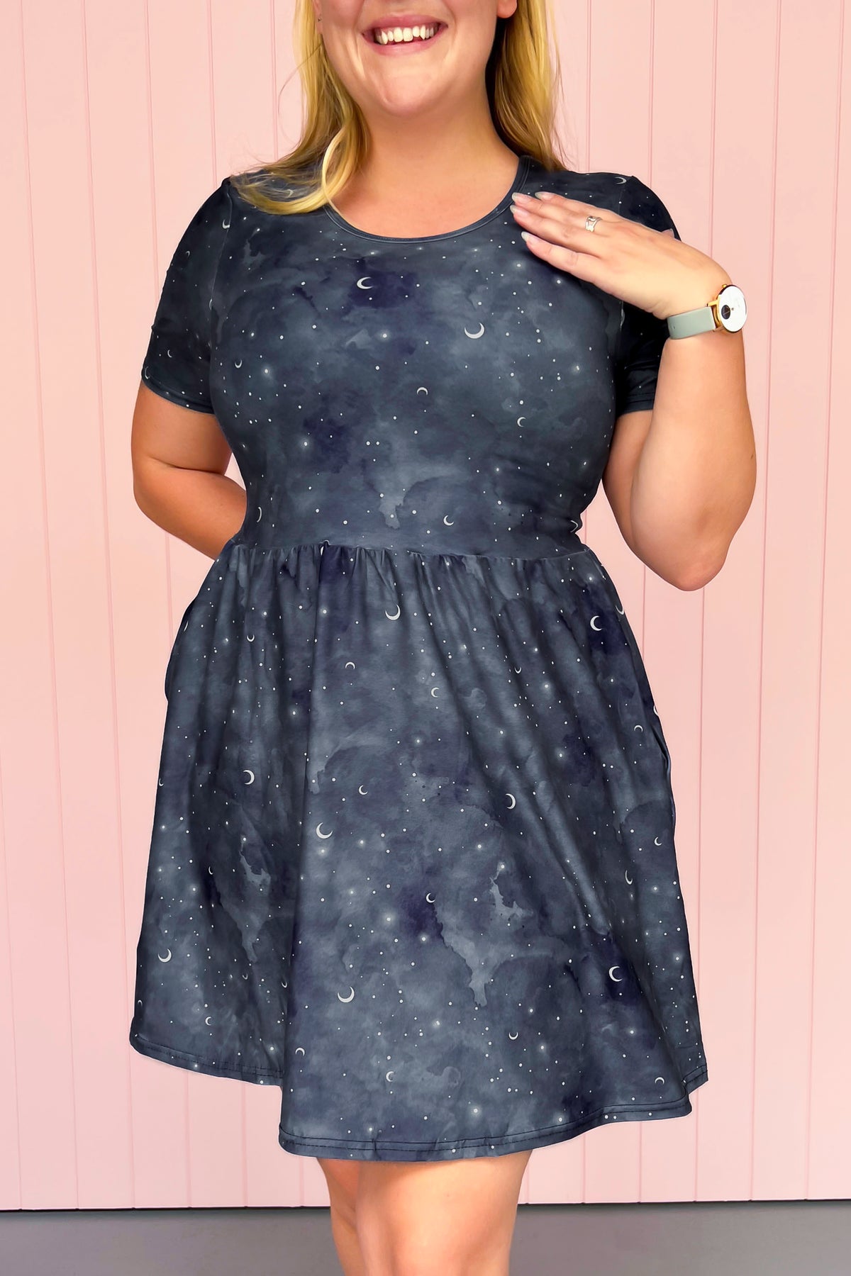 You don’t need a NASA-grade telescope to enjoy the beauty of the night sky, you just need the Midnight Dreams Mini Dress. Featuring a midnight-cloud inspired background of navy and blue, scattered with stars and crescent moons that make it feel as special as a quiet evening under the stars. And if you're someone that prefers wearing shorts under your dress for extra comfort, you can pair it with the matching shorts*.