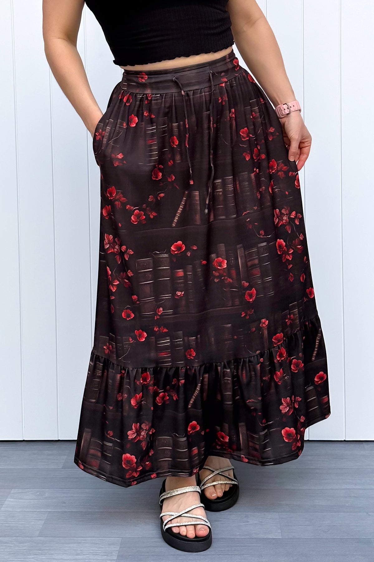 The Book Witch Selene Maxi Skirt feels like stepping into a candlelit library after midnight, where inky book spines and winding florals create a skirt rich with mystery and story. It’s moody, magical and made for those who love their style with a little depth and intrigue.