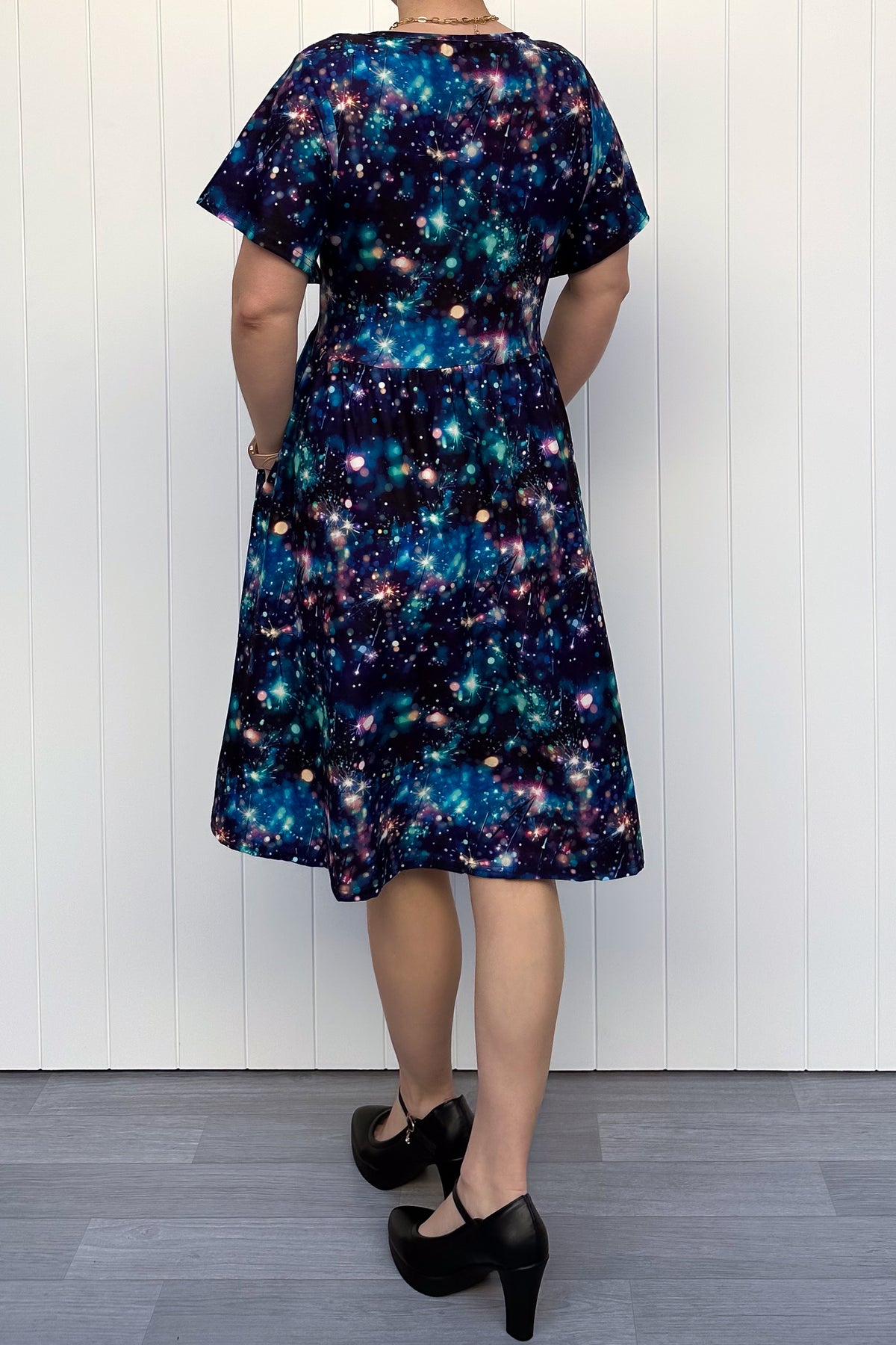 The Sparklers Knee-Length Dress captures the magic of celebration in a swirl of teal, violet and gold lights. Each glowing spark brings the print to life, making this dress perfect for festive gatherings, New Year fun or any day you want to sparkle a little brighter.