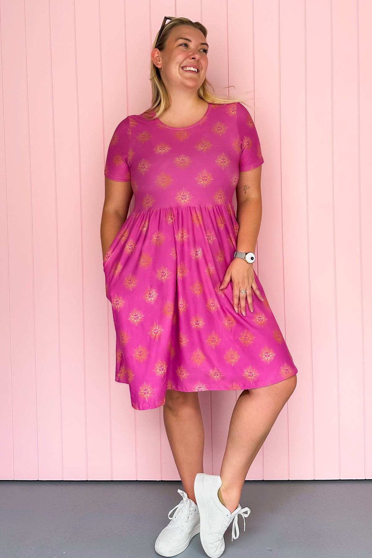 Channel the energy of the sun with the Sun-Kissed Magenta Knee Length Dress.  With radiant golden sunbursts printed on a vibrant magenta-pink background, you can give off warm, celestial vibes with every wear. Whether it reminds you of summer skies or golden hour, you can be sure wearing them will brighten any grey day! And if you're someone that prefers wearing shorts under your dress for extra comfort, you can pair it with the matching shorts*.